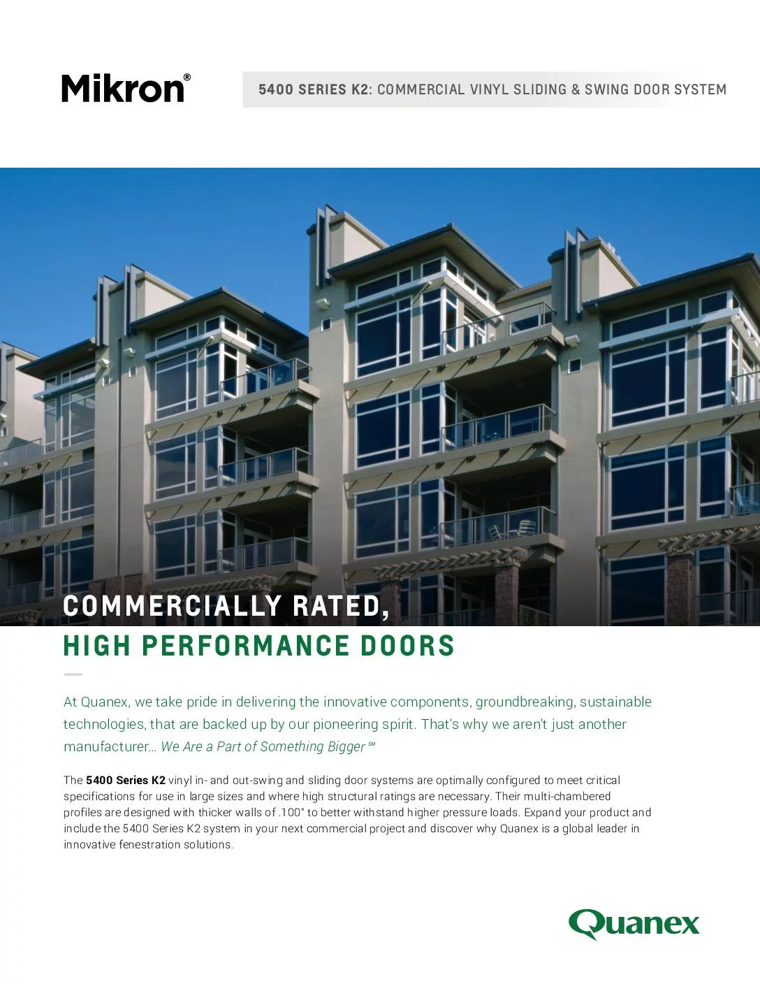 For heavy wind loads and other harsh weather conditions, Quanex’s 5400 (K2) swing patio door system meets and exceeds builders’ demands. With tested strength featuring MikronBlend® vinyl for durability and resistance to heat, impact and corrosion, the 5400 (K2) commercial swing patio door system is ideal for high-rise and coastal hurricane locations.