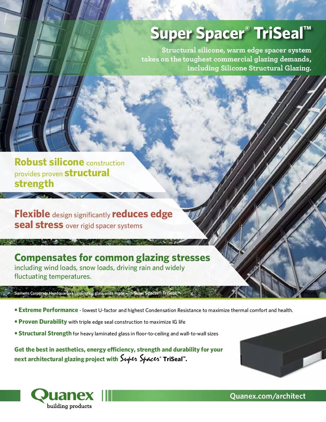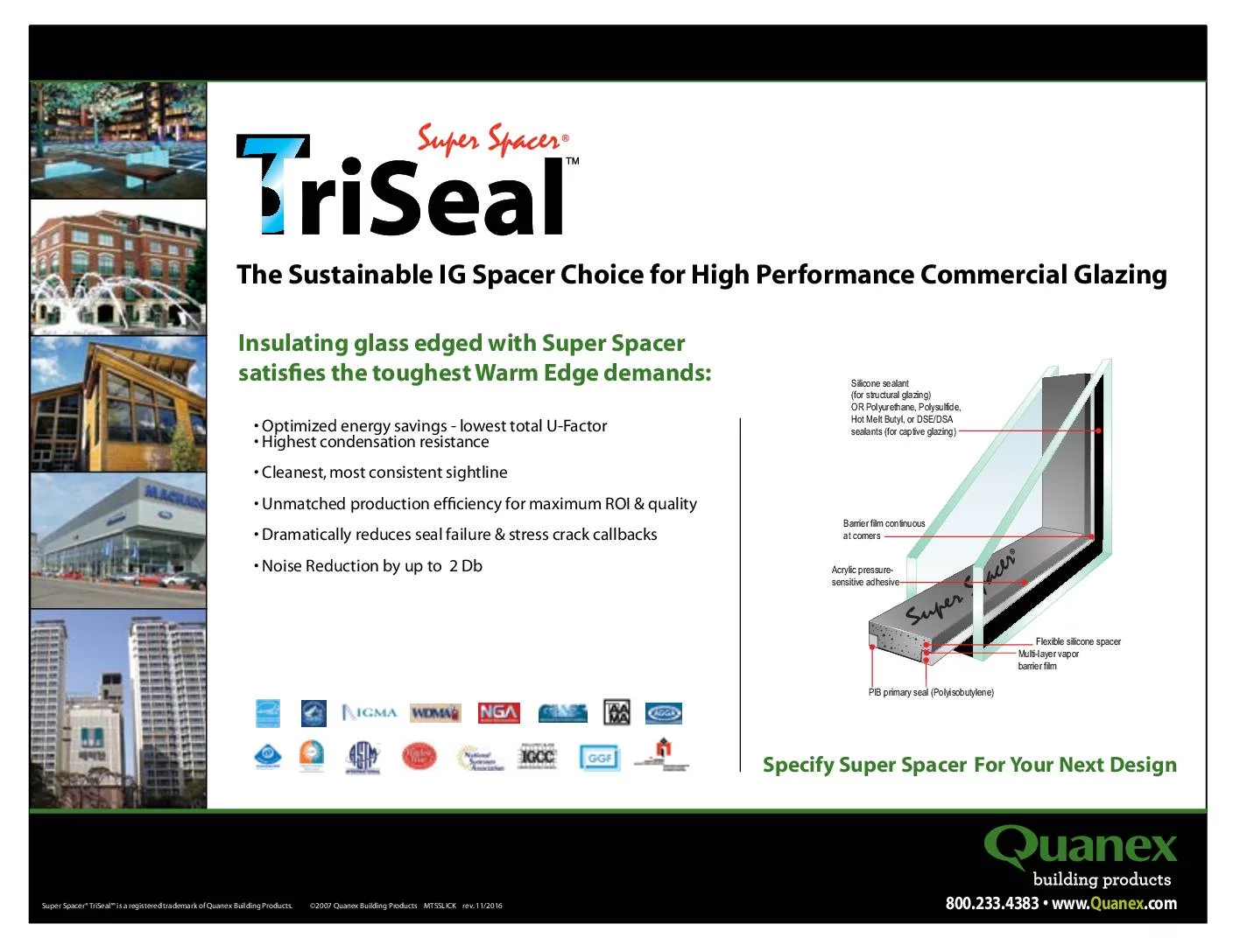 Quanex Super Spacer® TriSeal™ is the premium choice for all your commercial insulating glass (IG) spacer needs, including silicone structural glazing. Its unique triple seal design incorporates an inner acrylic adhesive seal for immediate unit handling, a polyisobutylene primary seal for enhanced gas retention and low moisture vapor transmission, and an outer silicone seal for proven structural strength and superior durability.