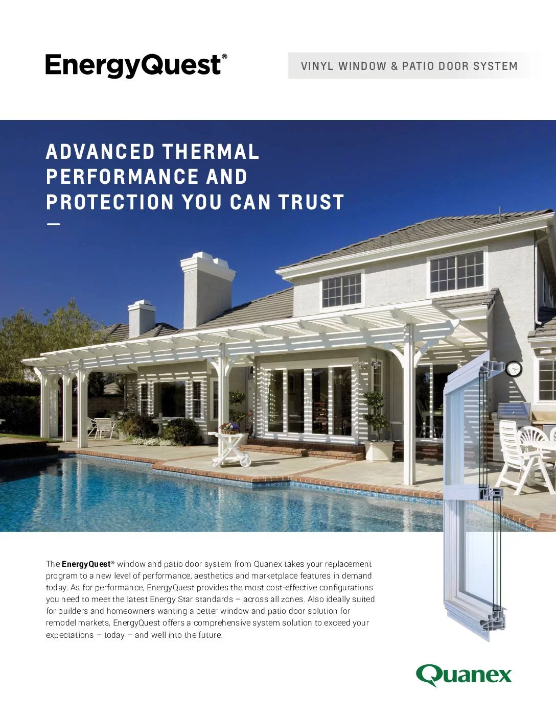 EnergyQuest Sliding Patio Door Systems are foam fill capable and can meet DP-50 residential structural ratings. A smaller frame cross-section also allows for pleasing aesthetics with a larger glazing area without any loss of performance. Ideal for both new construction and replacement application, EnergyQuest Sliding Patio Door Systems can help OEMs meet and exceed ENERGY STAR® criteria at a competitive price point.