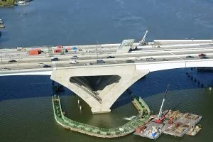 The $2.5 billion Woodrow Wilson Bridge Control Tower project was designed by Washington architectural firm, KressCox Associates (now Cox, Graae + Spack). The most architecturally interesting aspect is the bridge’s ship-like operator’s tower, an arresting vertical presence in curved glass that emulates the look of an ocean-going ship’s smoke stacks.